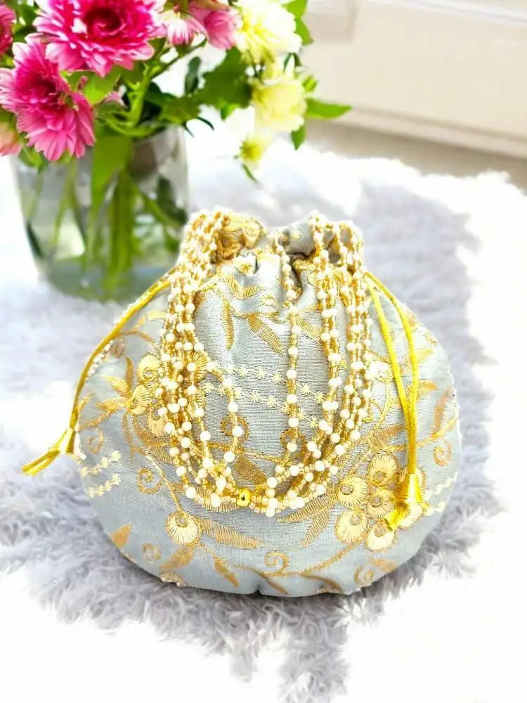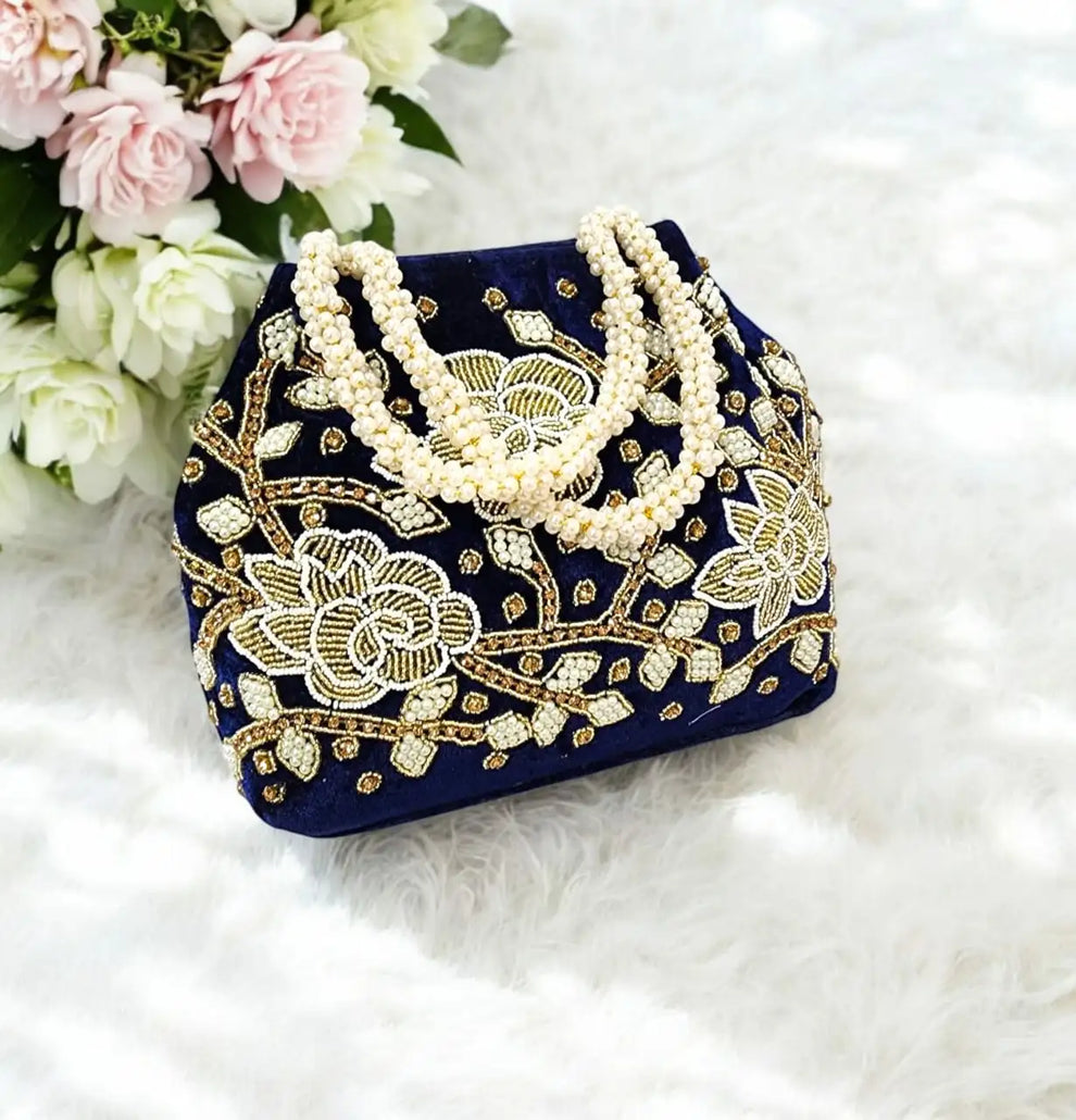 Handcrafted Floral Embroidered Potli & Clutch Combo - Ethnic Pearl Handle Set