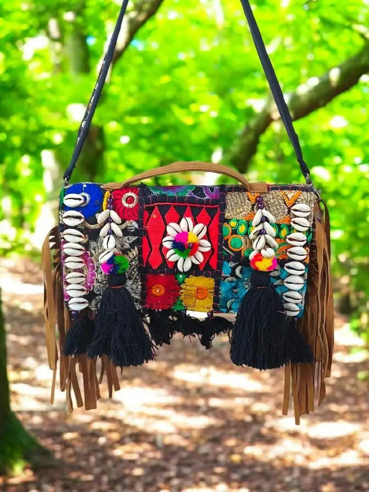 Handcrafted Boho Woven Sling Bag - Textured Crossbody with Braided Strap & Fringes