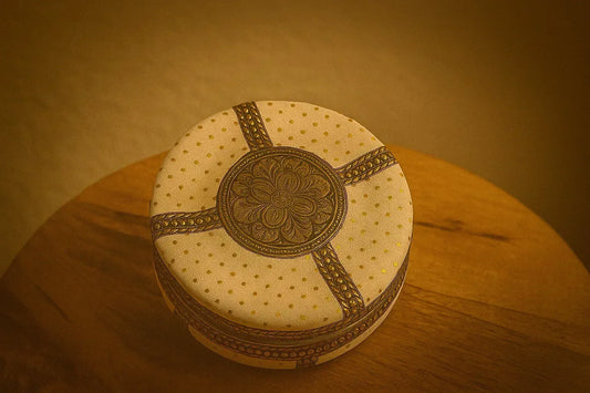 Decorative Steel Storage Box – Embossed Art Design Indian Handicraft – Round Metal Container