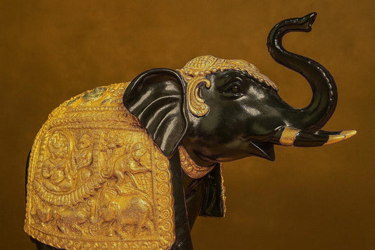 Black & Gold Resin Elephant Showpiece – Embossed Royal Design – Good Luck Decor for Home, Office & Gifting