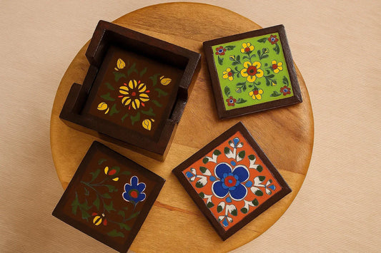 Hand-Painted Wooden Coaster Set with Ceramic Tiles - Set of 4 (4x4 Inch) with Holder