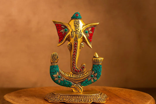 Brass Ganesha Idol with Turquoise & Coral Stone Inlay - Handcrafted Ganesh Murti Statue