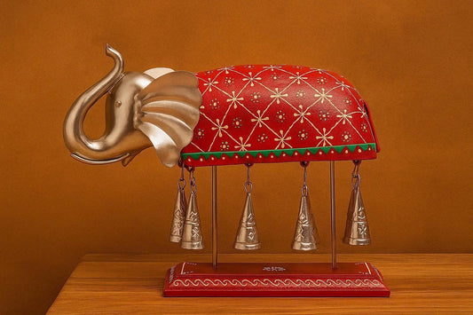 Hand-Painted Metal Elephant Showpiece with Hanging Bells - Rajasthani Good Luck Figurine