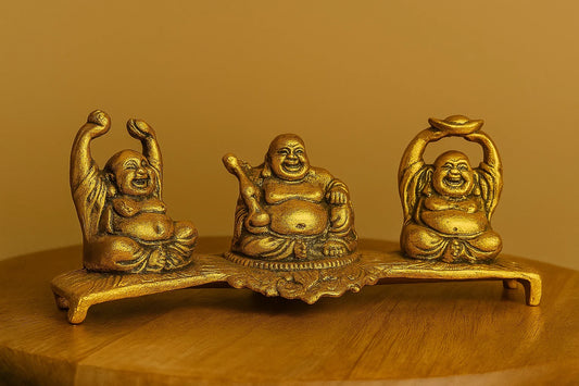 Brass Laughing Buddha Statue Set – Three Happy Buddha Figurines on a Base | Feng Shui Decor for Prosperity & Luck